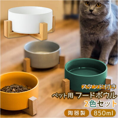 フードボウル 猫 楽天 ウォーターボウル 陶器 脚付 スタンド付き 2個 2つ セット 食器 食器台 餌皿 ペット食器 ペット用食器 皿 食べやすい ご飯 スタンド 木製 ねこ 子猫 猫用 いぬ 子犬 犬 犬用