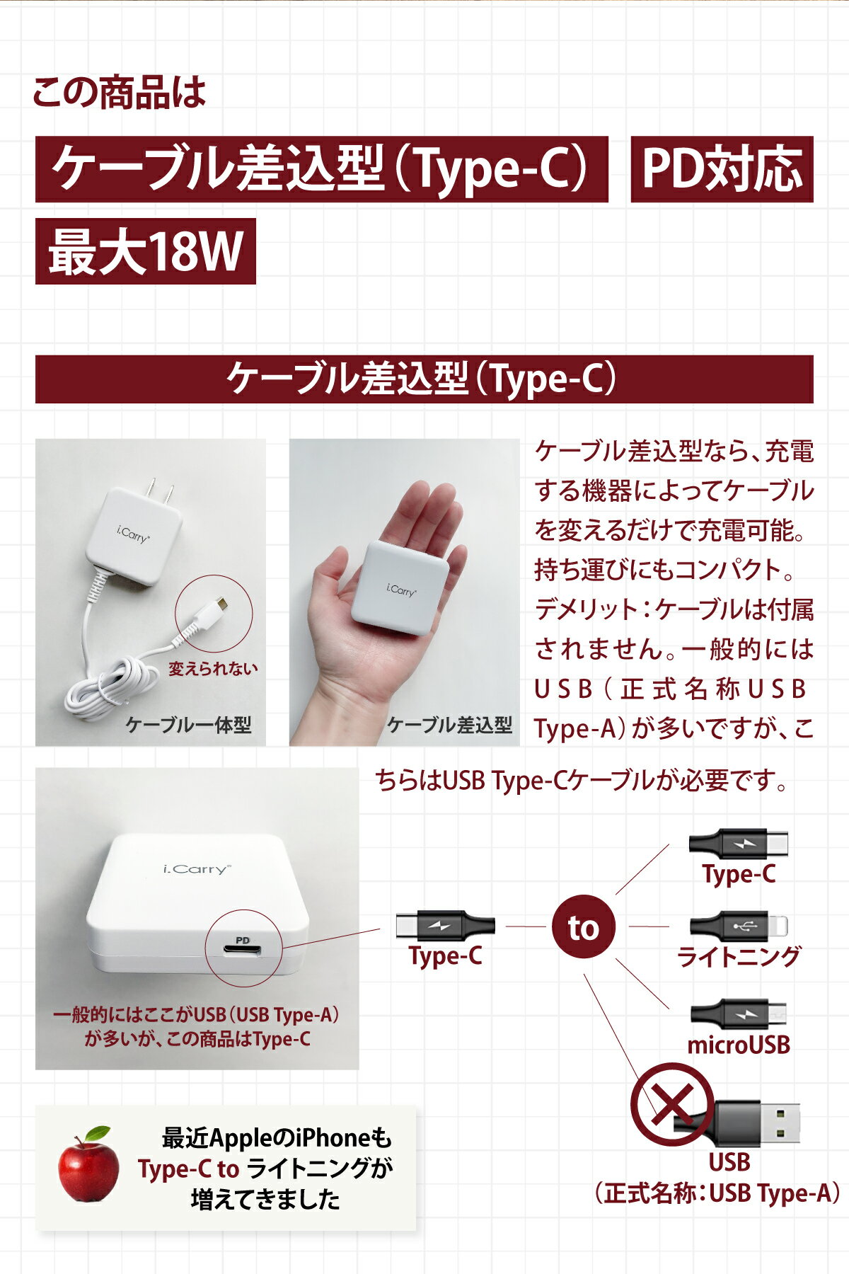 iCarry PD18w スリム USB コンセント i Phone13 12 充電器 【PD 18W 急速充電】 Galaxy Z Flip3 Fold3 5G ACアダプター パワーデリバリー 【Type-C ケーブル差込型】 アンドロイド スマートIC タブレット Switch アイコス