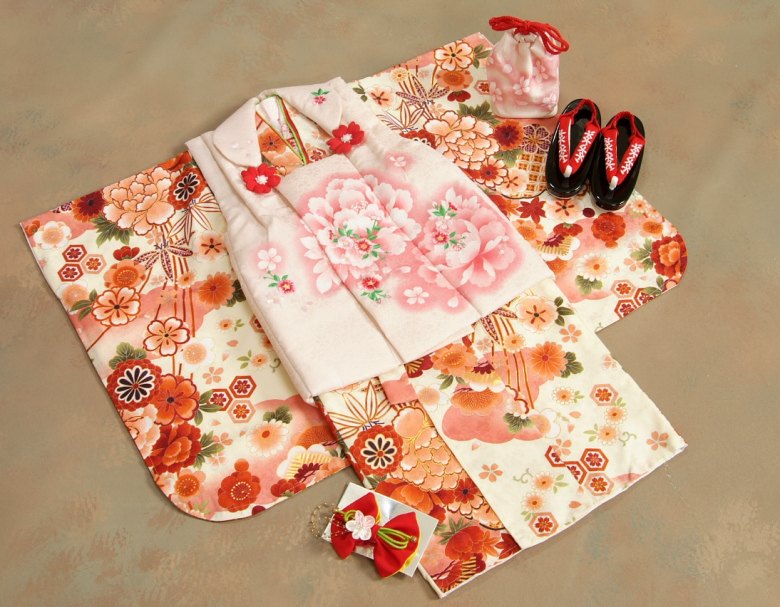 ※生地の裁断により柄の出方が変わりますので御了承下さい商品情報 商品番号 k7-14-010580u3 商品内容 着物 被布 長襦袢 二段重ね衿(縫い付け済み) かかとゴム付草履 きんちゃく 縫付け済み腰紐 りぼん髪飾り 刺繍半衿(縫い付け済み) 白足袋 着付け解説DVD 色目 着物 白色(オフホワイト系) 被布 淡いピンク色 草履判 黒色 素材 着物 ポリエステル100% 被布 ポリエステル100% 襦袢 ポリエステル100% 足袋 【表】キュプラ51%、ナイロン49%【裏】ナイロン100% 着物寸法 対象年齢 おもに2歳、3歳 対応身長 約85cm~105cm(お子様の体の厚みにもよりますが身長95cm前後であればお直しなしで着用可能です) 身丈 約90cm(約76cmに腰上げ済み) 袖丈 約57cm 裄丈 約46cm(約42cmに肩上げ済み) 被布コート丈 約50cm 草履寸法 草履判サイズ 約17.5cm(足のサイズ約15~18cmくらいまで対応) かかと高さ 約4cm ご注意 ※箱の中にたたんで収納されているため軽いタタミしわがついている場合がございますのでご了承下さい ※生地の裁断位置により多少柄の出方が変わることがございます ※店舗での並行販売も行っていますので箱に多少の汚れがあります ※染め物ですので細かい染料とび(気にならない程度の物)はご了承下さい ※クリーニングに関しましてはメーカー表示のタグに従いながら行って下さい クリーム系のオフホワイト地御着物に淡いピンク色の被布の組み合わせのマユミブランドの被布セットです!! 生地はポリエステル素材ですが織り柄である地紋が入っていますので比較的しっかりとした生地感になります!! 御着物には二段の重ね衿が付いて衿回りも華やかさがあり、初めから肩上げと腰上げもしてあります!! 被布着には刺繍が施してあり豪華さもあります!! 御着物には前紐が縫い付けてありますので簡単に着せて頂けると思います!! 後ろ身頃にも柄と刺繍が入っていて雰囲気を損ないません!! 長襦袢には刺繍半襟も初めから縫い付けてありますので別で縫い付ける手間もありません!! 脱げ防止のかかとゴムの付いた草履ときんちゃくに日本製白足袋と髪飾りもセットになっています!!!! 御着物を収納する箱にお入れいたします!!