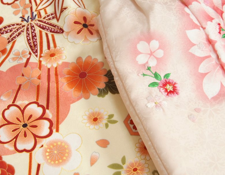 お色目はクリームがかった白色(オフホワイト)に淡いピンクの被布を合わせたセットで被布には刺繍が柄には金彩の縁取りがほどこしてありますので高級感もあります。