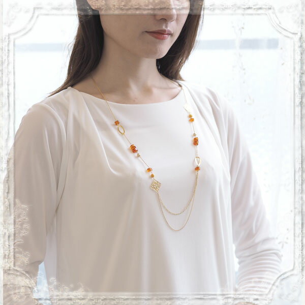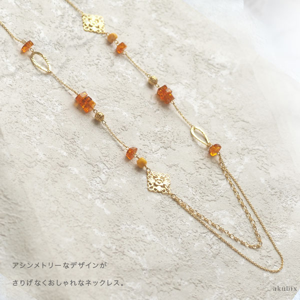 グリッターを多く含む華やかなオレンジゴールドアンバーと さざれカットのロイヤルアンバーを連ねたロングネックレス。