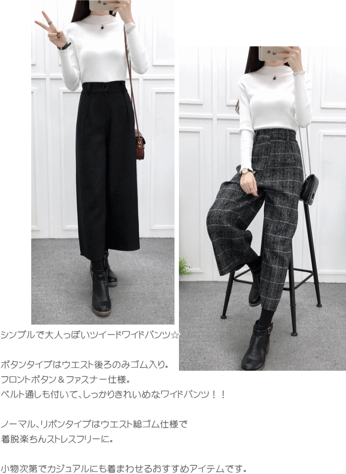 【透け感】なし 【伸縮性】なし 【裏地】なし シンプルで大人っぽいツイードワイドパンツ☆